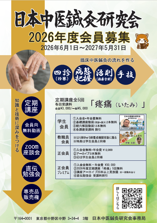 - ニュースメール登録を始めました登録された方に日本中医鍼灸研究会の今後の活動をお知らせします。氏名(ニックネーム)とメールアドレスのみのご登録… 続きを読む: ニュースメール登録を始めました